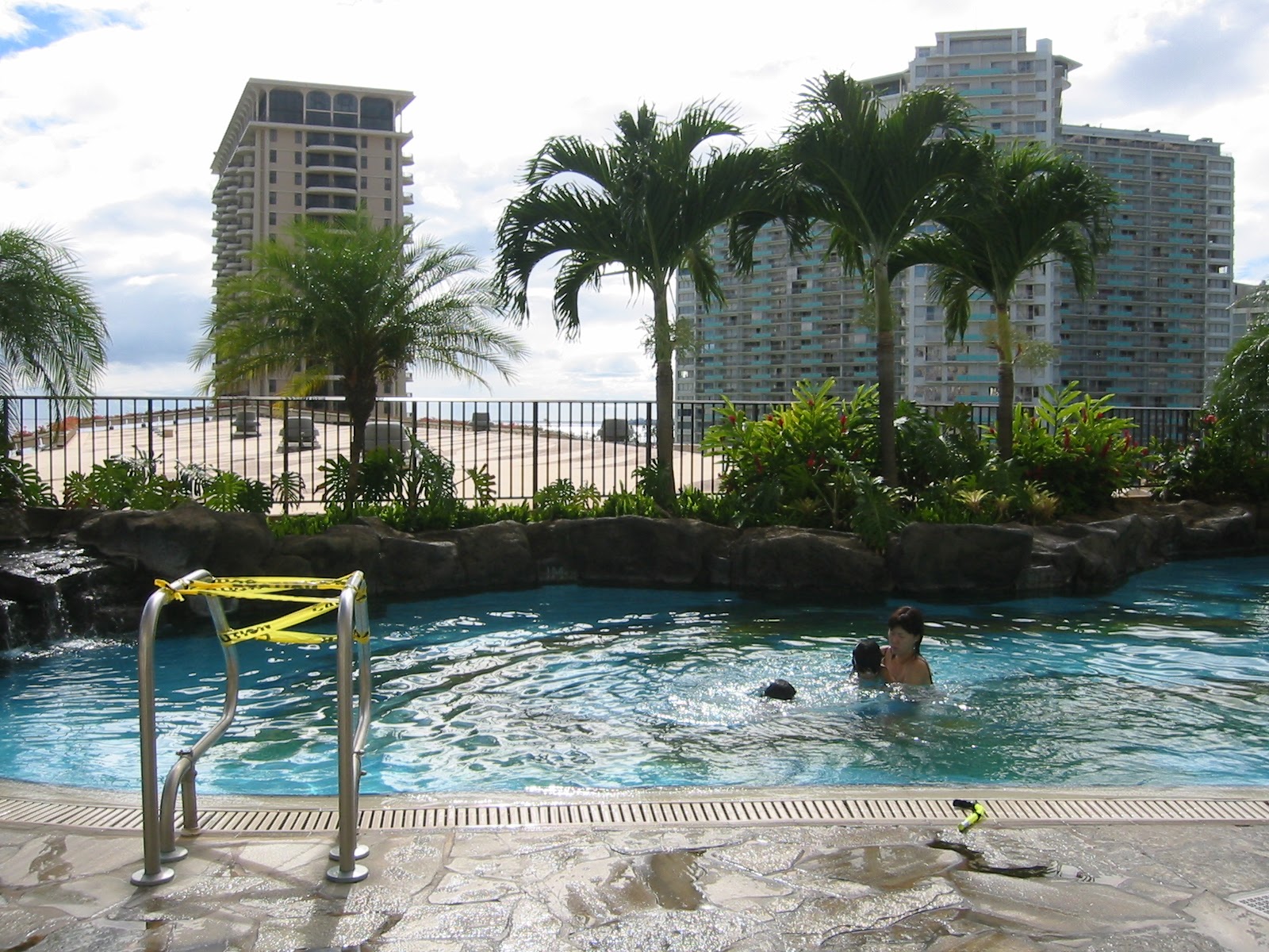 2004年、2回目のオアフ島は、HISの6日間ツアーに延泊を加えて、7日間のツアーでした。二人の娘がスイミングを習っており、プール三昧で楽しみたいと言うことで、子供向けのプールがあるホテルをえらびました。2005年はマウイ島に行った最終日をここで過ごしました。