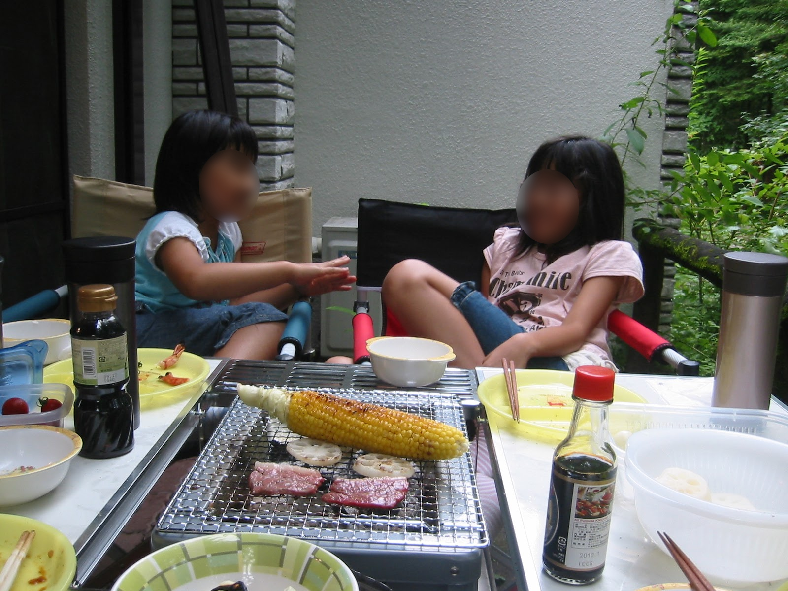 この保養所の魅力といえば、やはり庭でのバーベキューです。道具の貸し出しはなかったので、キャンプ用品を持参して炭火焼きを楽しみました。